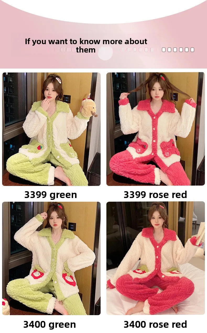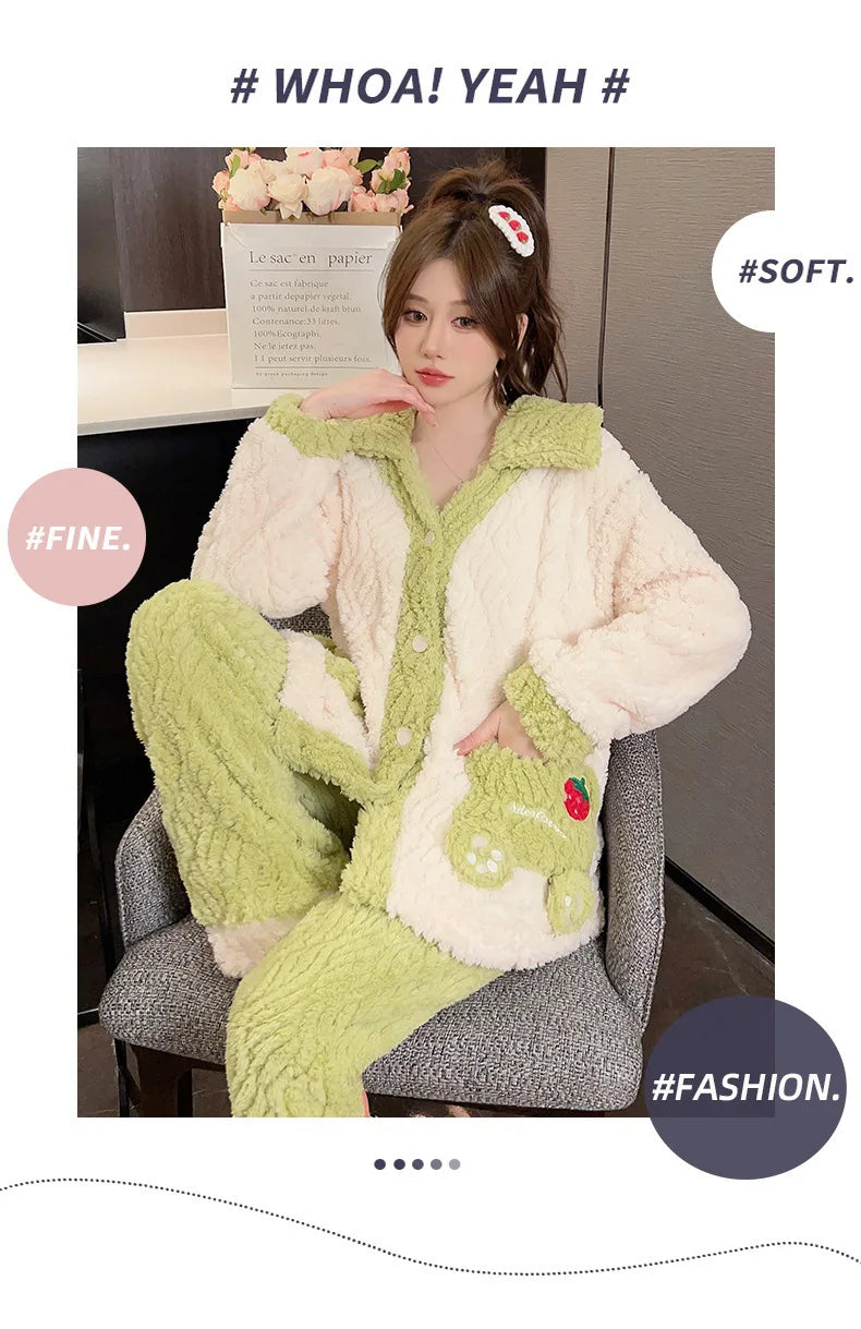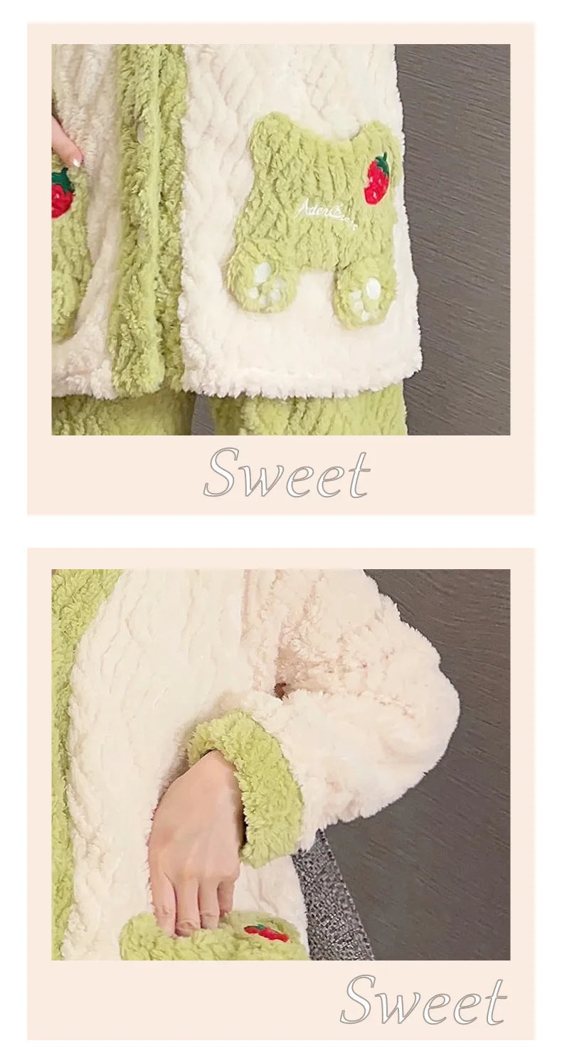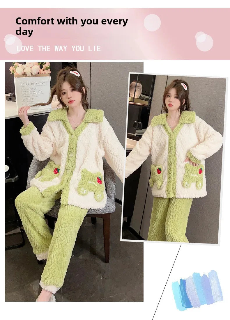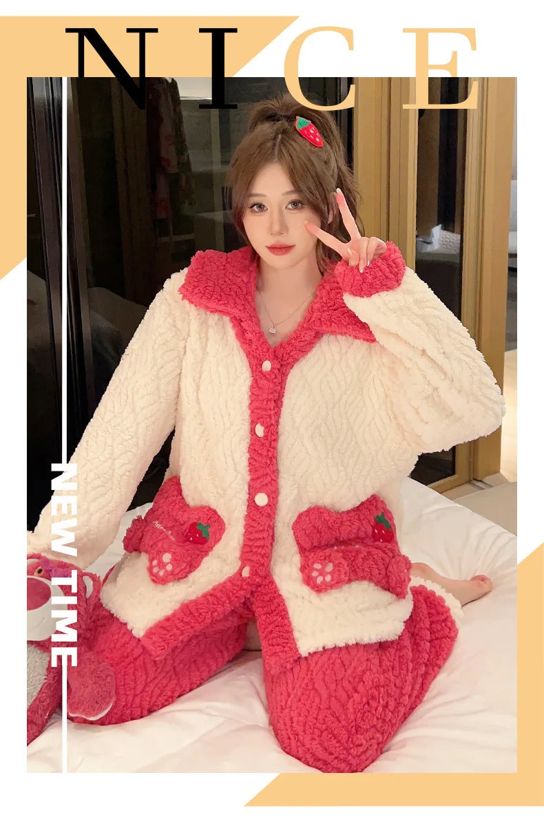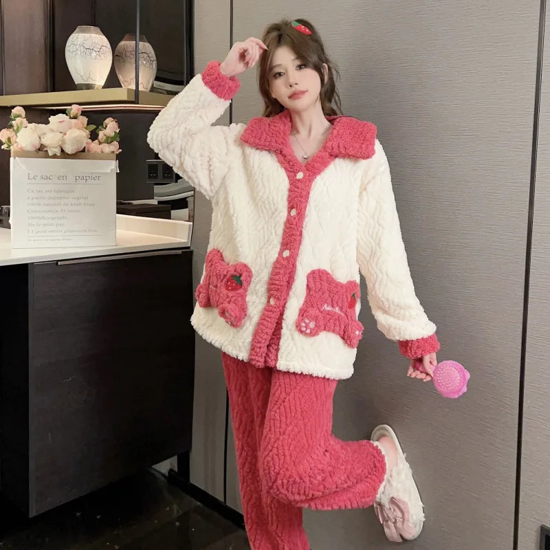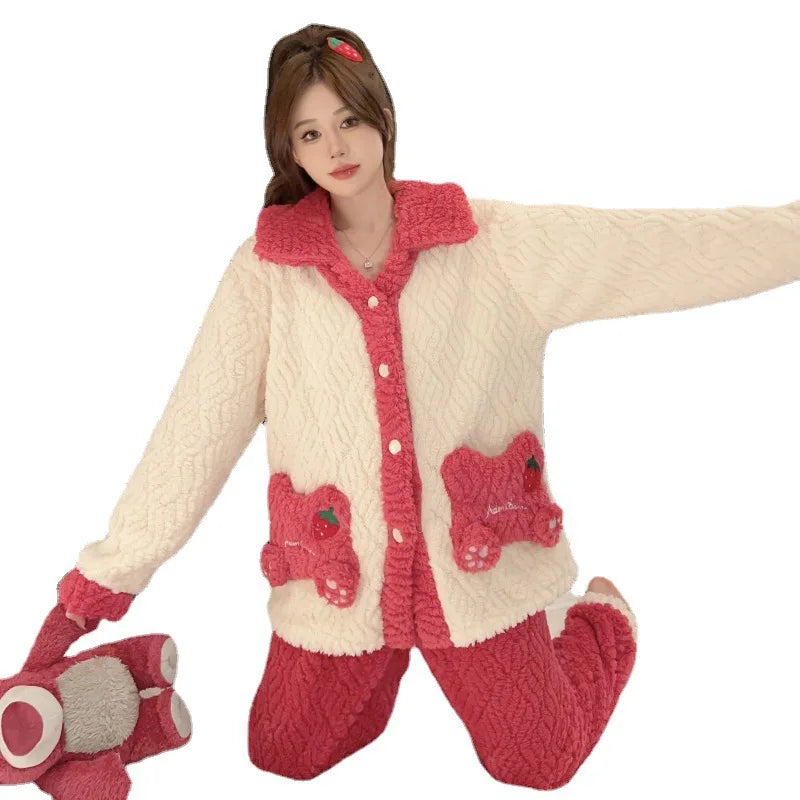 Women'S Cozy Fleece Pajama Set with Bear Embroidery - Long Sleeve, Loose Fit, V-Neck, Button-Up Front, Pockets, Soft & Warm for Fall/Winter, Casual Home Wear, Winter Pajamas | Relaxed Fit Pajamas | Construction, Pajamas for W