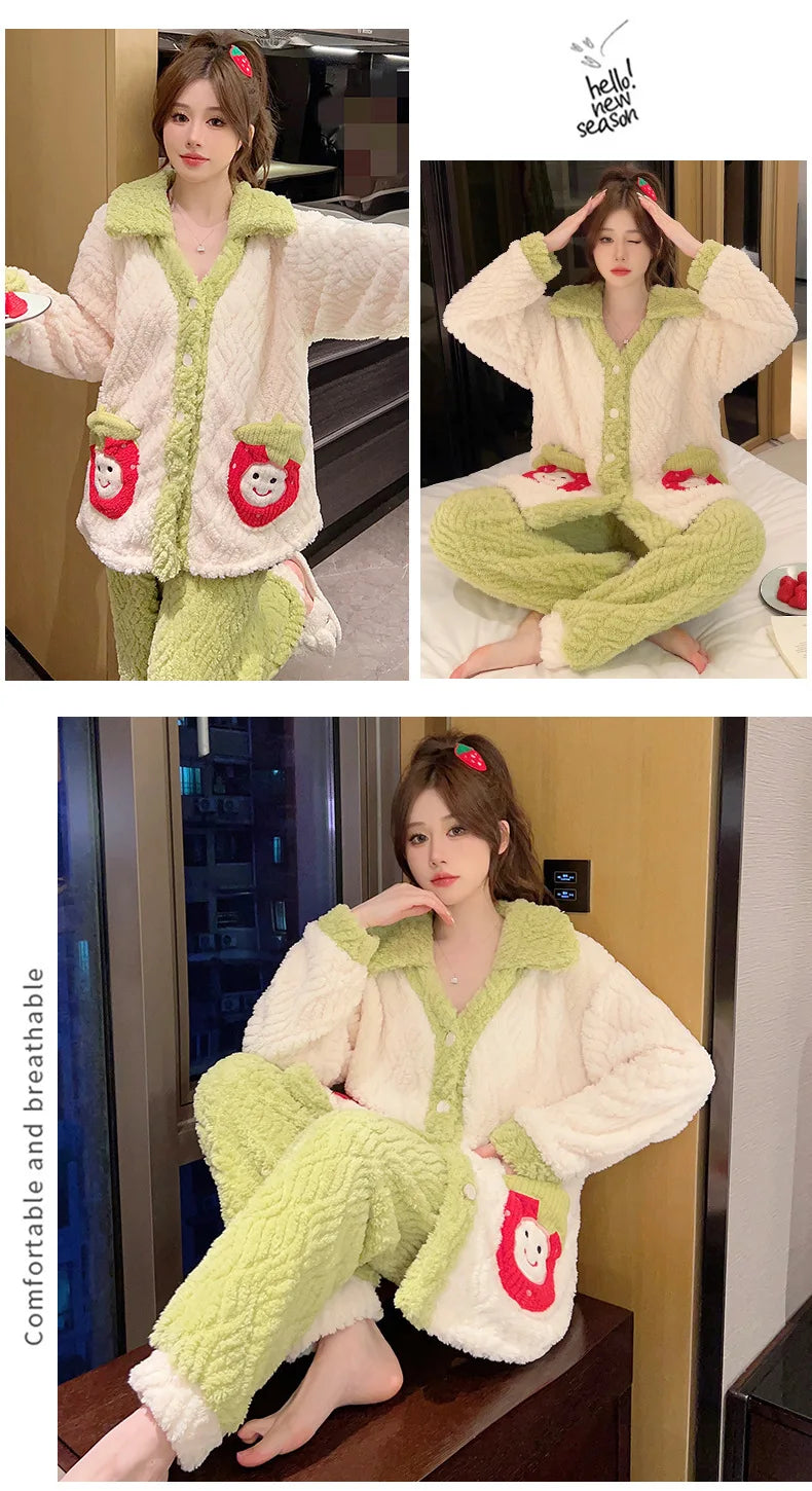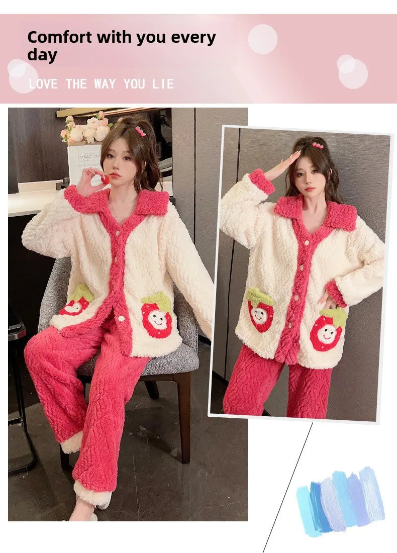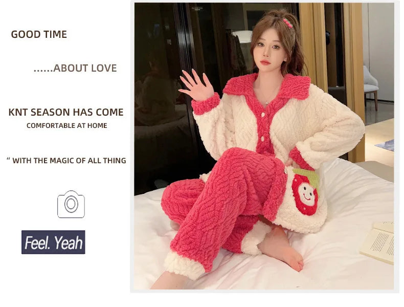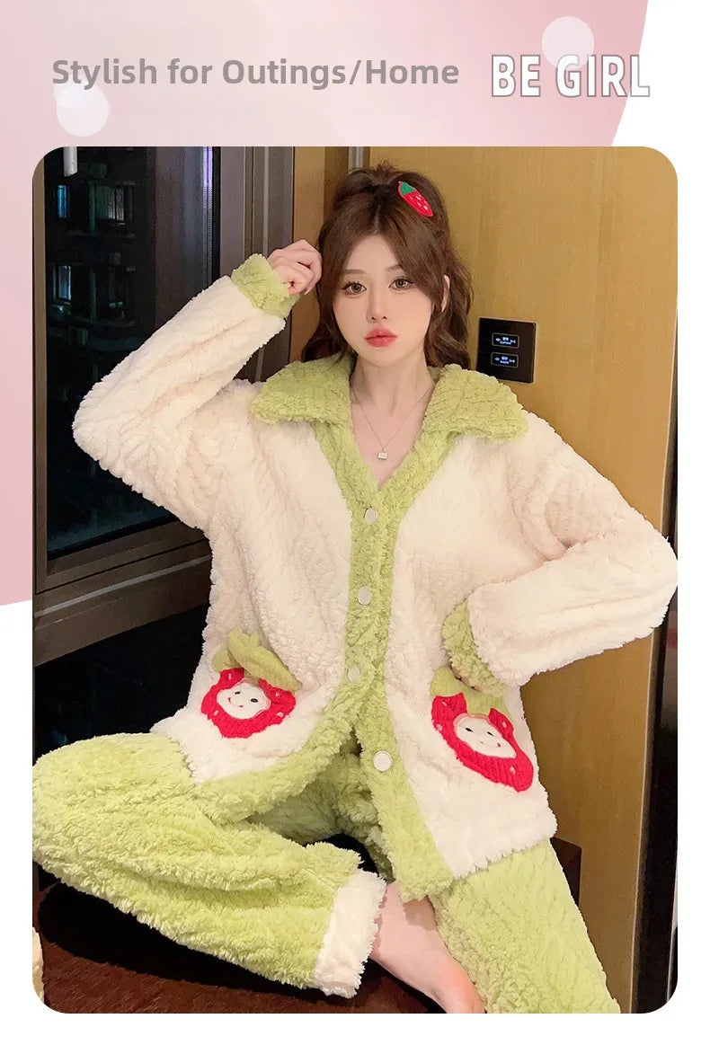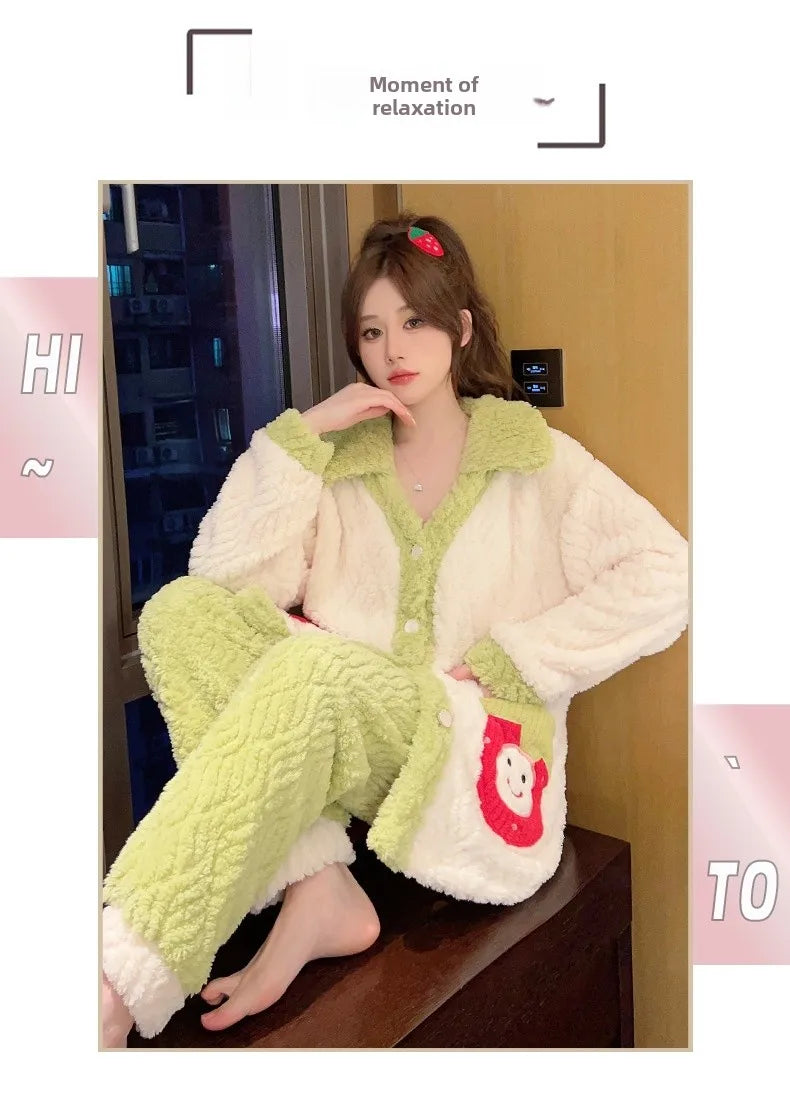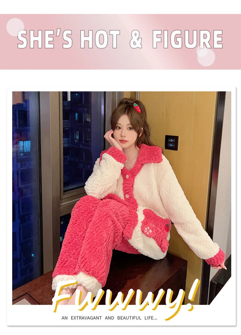 Women'S Cozy Fleece Pajama Set with Bear Embroidery - Long Sleeve, Loose Fit, V-Neck, Button-Up Front, Pockets, Soft & Warm for Fall/Winter, Casual Home Wear, Winter Pajamas | Relaxed Fit Pajamas | Construction, Pajamas for W