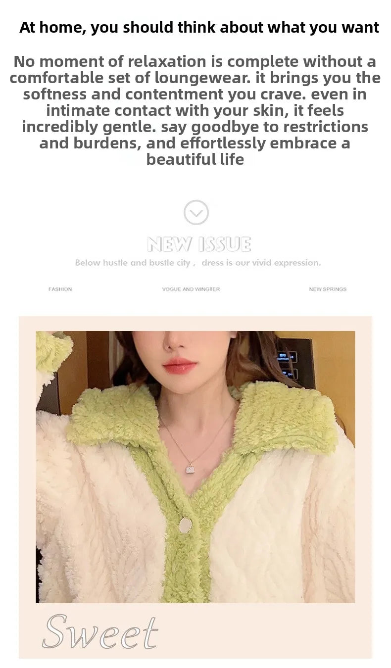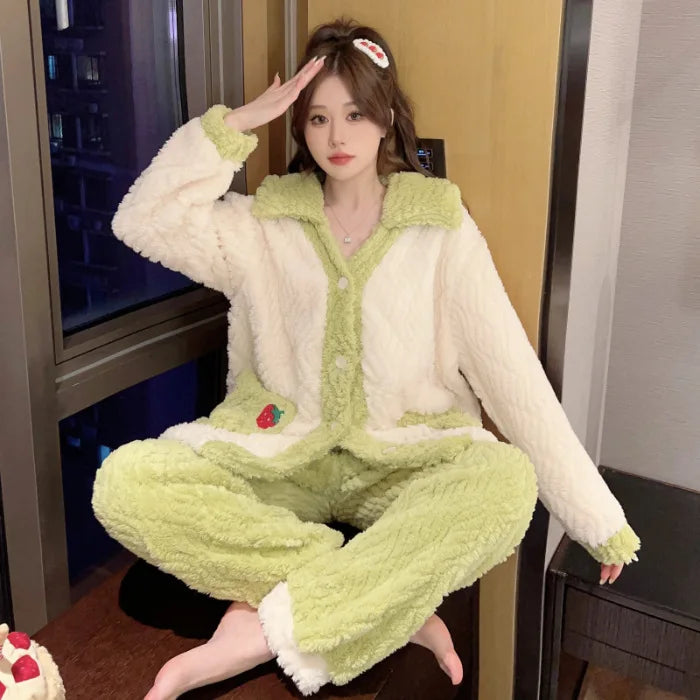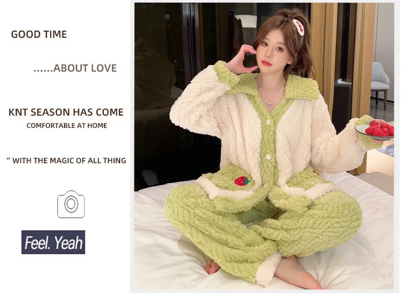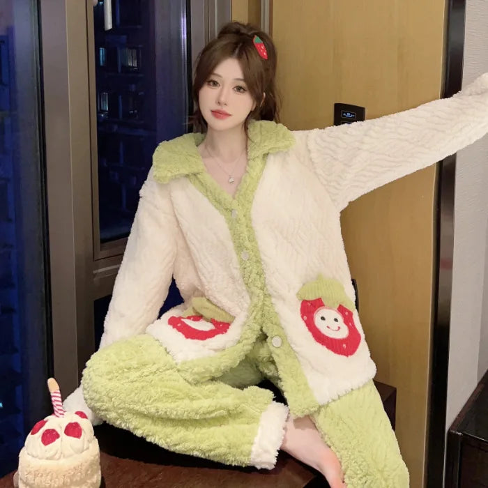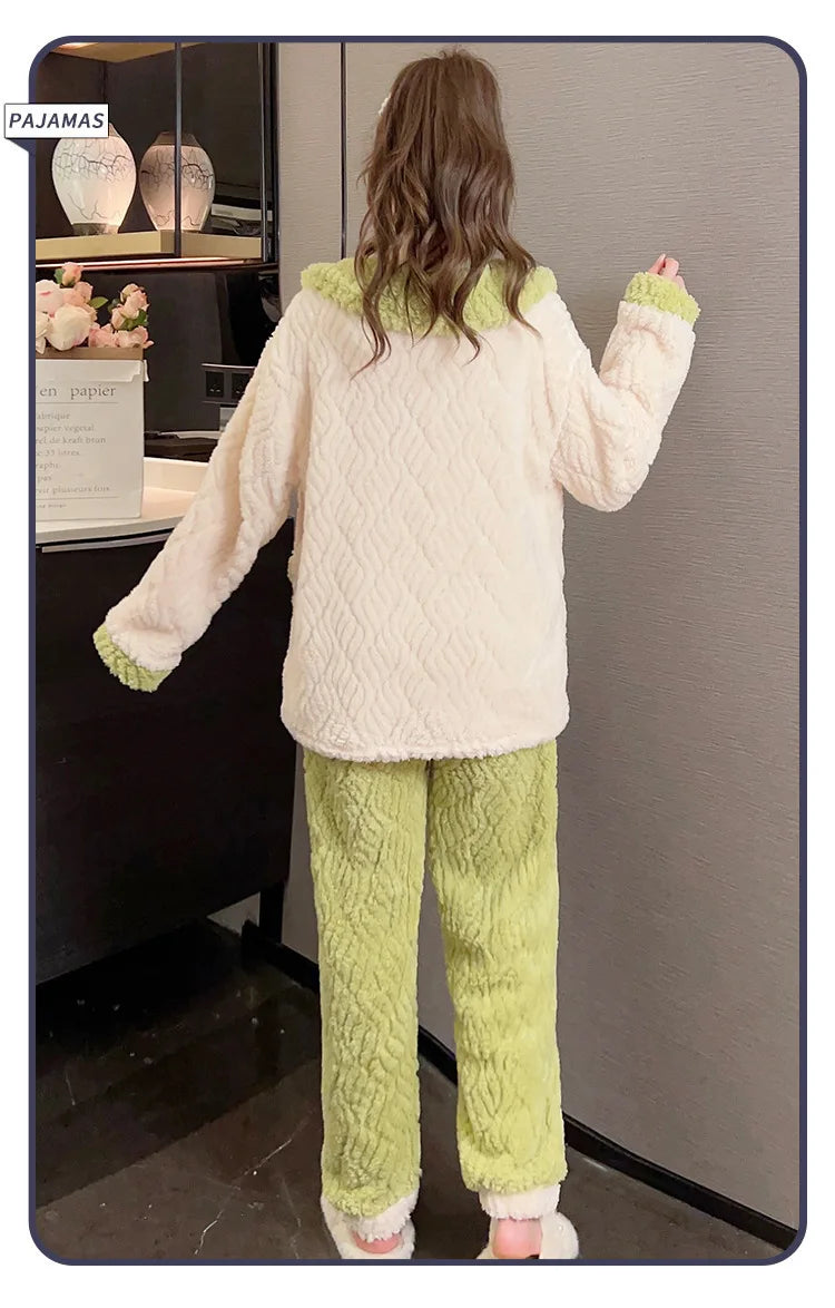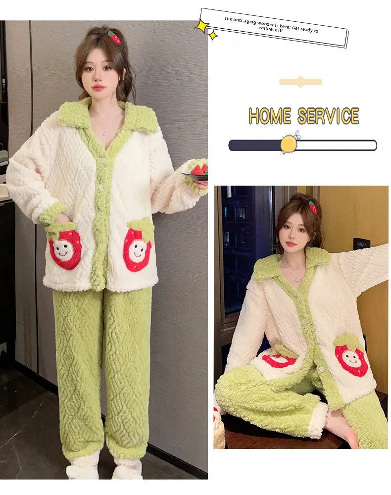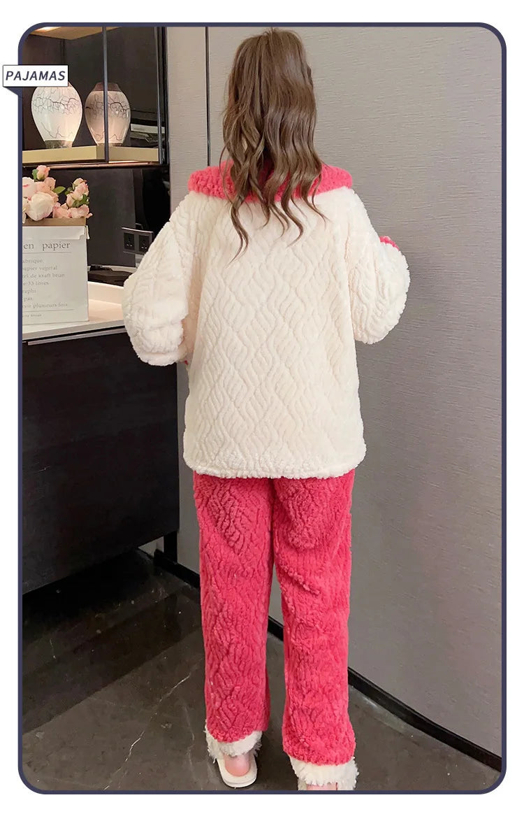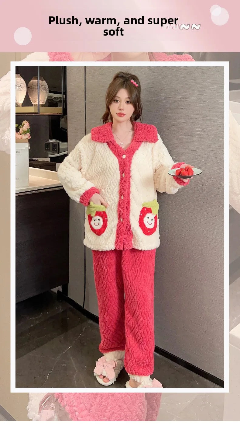 Women'S Cozy Fleece Pajama Set with Bear Embroidery - Long Sleeve, Loose Fit, V-Neck, Button-Up Front, Pockets, Soft & Warm for Fall/Winter, Casual Home Wear, Winter Pajamas | Relaxed Fit Pajamas | Construction, Pajamas for W